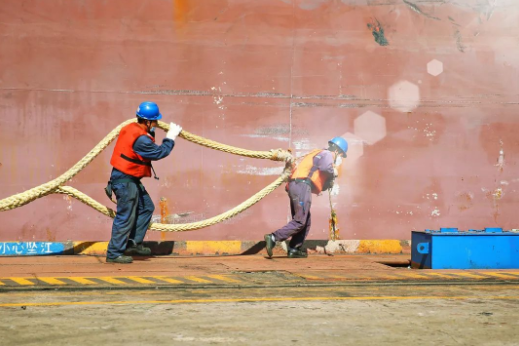 下午驕陽(yáng)似火,修船碼頭帶纜工人正在給剛剛靠泊的船舶帶纜繩。