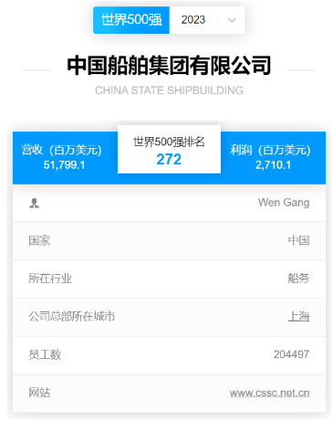 北京時間2023年8月2日,《財(cái)富》中英文網(wǎng)站同時發(fā)布2023《財(cái)富》世界500強(qiáng)排行榜,中國船舶集團(tuán)有限公司以517.991億美元的營業(yè)收入位列全球榜單第272位,自2021年重組后首次申報(bào)以來連續(xù)三年上榜,蟬聯(lián)全球造船企業(yè)首位。