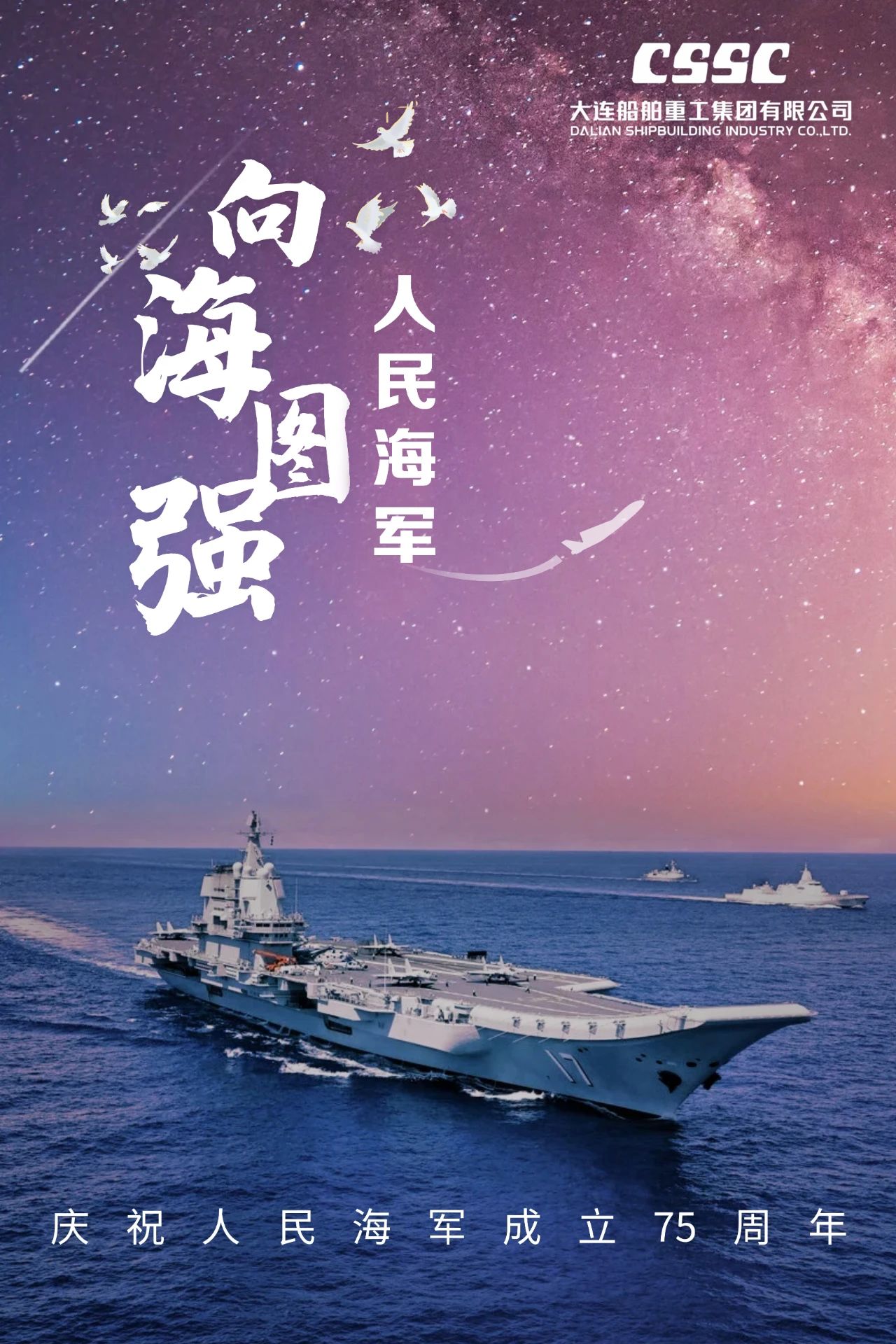 人民海軍 七十五載風雨歷程 向海圖強 乘風破浪逐夢深藍 ——大連造船(姜秉尚) ——七院(任娟) ——七〇八所(曹璐、宋卓璟) ——武昌造船(丁慧 、周建仁) ——系統(tǒng)工程研究院(邵鴻飛、姬國偉) ——廣船國際(董入豪) 英雄的艦隊向前方 筑起萬里鋼鐵海疆