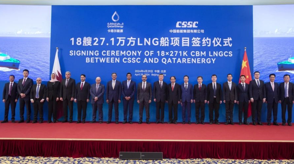 4月29日,中國(guó)船舶集團(tuán)有限公司與卡塔爾能源在京舉行18艘全球最大27.1萬立方米超大型液化天然氣(LNG)運(yùn)輸船項(xiàng)目簽約儀式。工業(yè)和信息化部副部長(zhǎng)單忠德,外交部西亞北非司大使呂健,中國(guó)船舶集團(tuán)董事長(zhǎng)溫剛、副總經(jīng)理盛紀(jì)綱,卡塔爾能源事務(wù)國(guó)務(wù)大臣、卡塔爾能源總裁兼首席執(zhí)行官薩阿德·謝里達(dá)·阿爾卡比,卡塔爾能源天然氣首席執(zhí)行官卡利德·阿爾-塞尼,卡塔爾能源商務(wù)和業(yè)務(wù)發(fā)展執(zhí)行副總裁賈西姆·阿爾馬拉祖齊等領(lǐng)導(dǎo)和嘉賓出席簽約儀式。