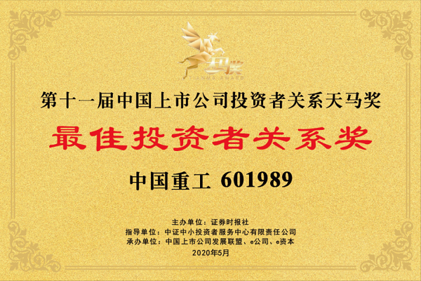????中國(guó)船舶集團(tuán)旗下中國(guó)重工于近日榮獲由證券時(shí)報(bào)社主辦的“第11屆中國(guó)上市公司投資者關(guān)系天馬獎(jiǎng)——最佳投資者關(guān)系獎(jiǎng)”,滬深兩市共有100家上市公司獲得該獎(jiǎng)項(xiàng)。