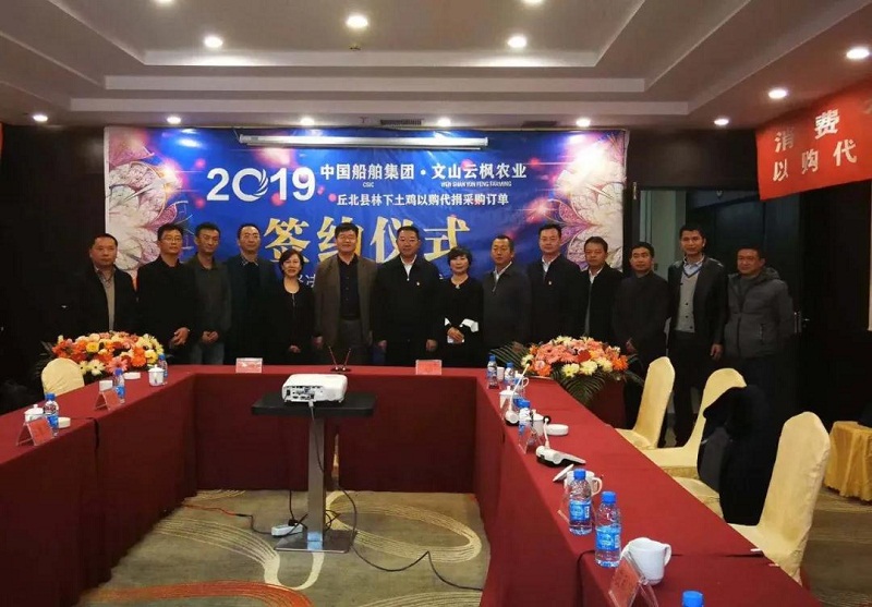 2019年12月22日,中國船舶集團(tuán)-云南文山云楓農(nóng)業(yè)丘北縣林下養(yǎng)雞“以購代捐”采購訂單簽約儀式在云南丘北縣舉行。