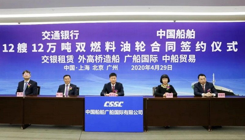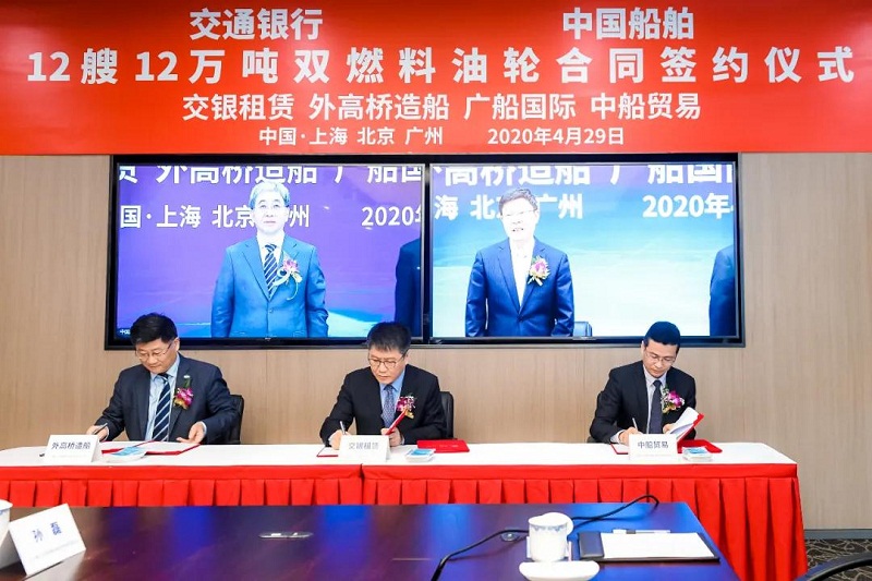 ????4月29日,中國(guó)船舶集團(tuán)有限公司旗下中國(guó)船舶工業(yè)貿(mào)易有限公司、上海外高橋造船有限公司、廣船國(guó)際有限公司與交通銀行股份有限公司旗下交銀金融租賃有限責(zé)任公司在北京、上海、廣州三地以“云簽約”方式簽署12艘12萬(wàn)噸雙燃料油船建造合同,合同總金額約46億元人民幣,這是中國(guó)船舶集團(tuán)旗下單位近期承接的又一單筆大額訂單。中國(guó)船舶集團(tuán)黨組書記、董事長(zhǎng)雷凡培,交通銀行黨委書記、董事長(zhǎng)任德奇,中國(guó)船舶集團(tuán)黨組成員、副總經(jīng)理孫偉,交通銀行黨委委員、副行長(zhǎng)呂家進(jìn)出席簽約儀式。