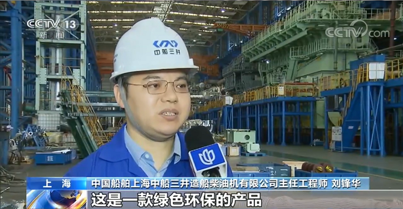 ????中國船舶上海中船三井造船柴油機(jī)有限公司主任工程師 劉鋒華:尺寸最大,達(dá)到了5層樓那么高,功率達(dá)到了63800多千瓦,功率也是最大的。這是一款綠色環(huán)保的產(chǎn)品,使用燃?xì)膺\行時氮氧化物的排放不到常規(guī)發(fā)動機(jī)的十分之一,硫氧化物和顆粒物的排放也是非常好的,不用裝任何后處理設(shè)備,都可以滿足IMO(國際海事組織)最新的排放法規(guī)要求。