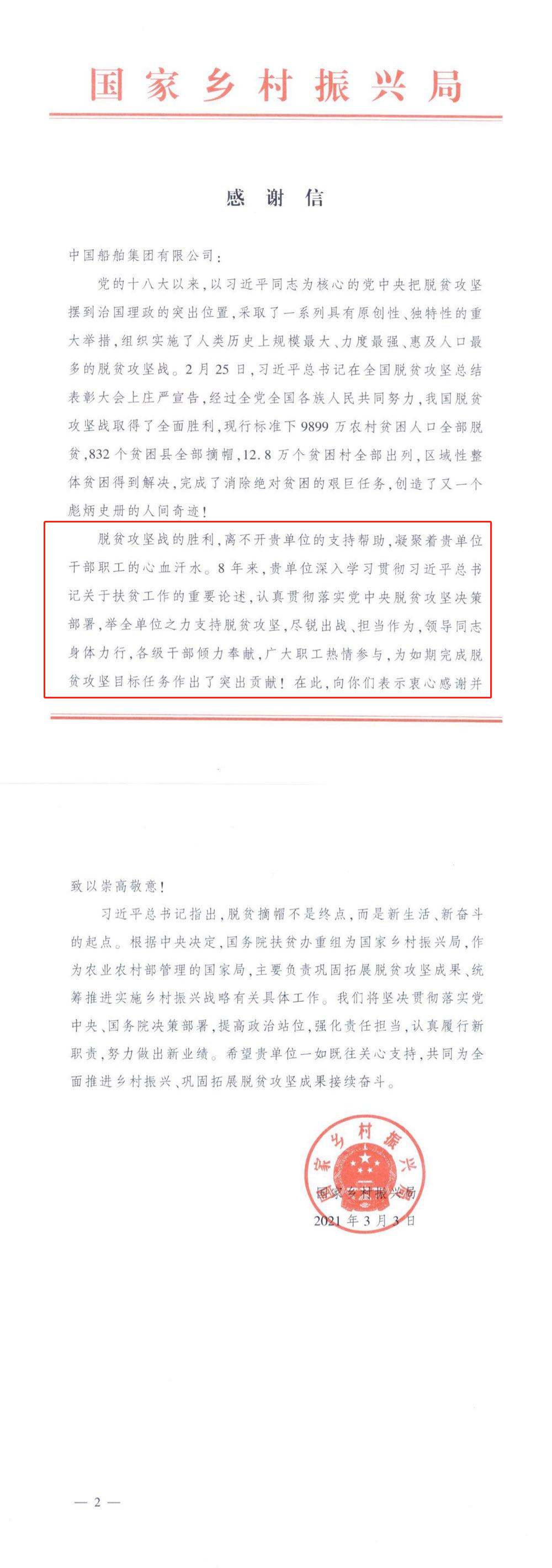 日前,中國船舶集團(tuán)收到一封特殊的感謝信。信中對中國船舶集團(tuán)8年來的擔(dān)當(dāng)作為、傾情奉獻(xiàn)表示感謝和敬意,這封信來自不久前剛剛掛牌的國家鄉(xiāng)村振興局。