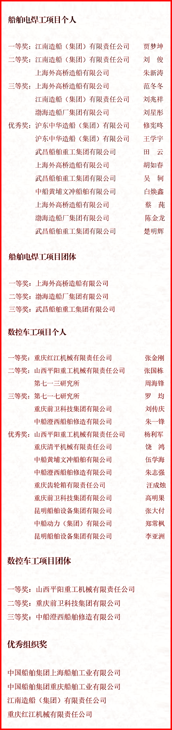 本次競(jìng)賽是中國(guó)船舶集團(tuán)有限公司組建以來(lái)舉辦的首屆職業(yè)技能競(jìng)賽,競(jìng)賽項(xiàng)目既有船舶行業(yè)主體工種——船舶電焊工,又有現(xiàn)代制造業(yè)重要工種——數(shù)控車(chē)工。競(jìng)賽由上海公司、江南造船、重慶公司、重慶紅江等四家單位承辦。參賽選手們相互學(xué)習(xí)交流、深入切磋技藝,展現(xiàn)了中國(guó)船舶技能人才頑強(qiáng)拼搏、追求卓越的良好精神面貌!