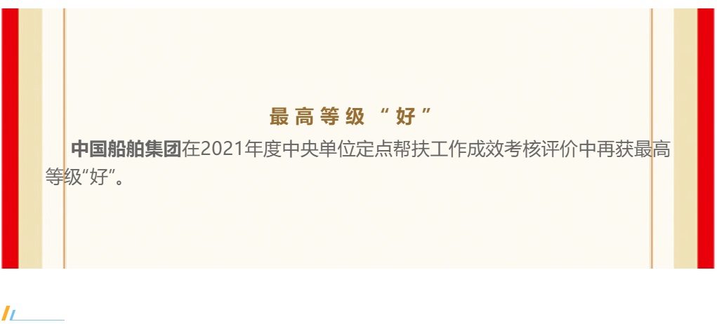 近日,中國船舶集團(tuán)在2021年度中央單位定點(diǎn)幫扶工作成效考核評價中再獲最高等級“好”。這是自2019年組建成立以來,中國船舶集團(tuán)連續(xù)第三年獲“好”。