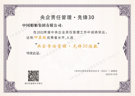 2022年12月20日,由國(guó)務(wù)院國(guó)資委社會(huì)責(zé)任局主辦、中國(guó)社會(huì)責(zé)任百人論壇承辦的“新征程 新責(zé)任——《中央企業(yè)社會(huì)責(zé)任藍(lán)皮書(shū)(2022)》《國(guó)資國(guó)企社會(huì)責(zé)任藍(lán)皮書(shū)(2022)》發(fā)布活動(dòng)”在京舉行。活動(dòng)以“云端會(huì)議”的方式舉辦,發(fā)布了“央企責(zé)任管理 · 先鋒30指數(shù)”,中國(guó)船舶集團(tuán)入選該指數(shù)。