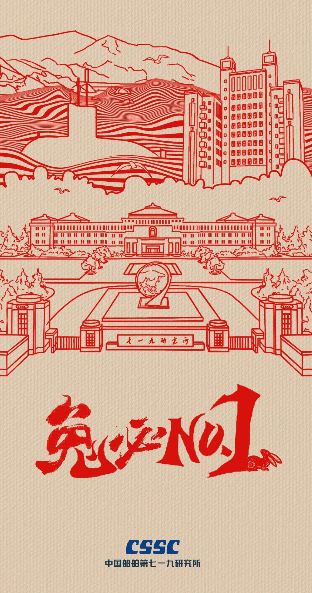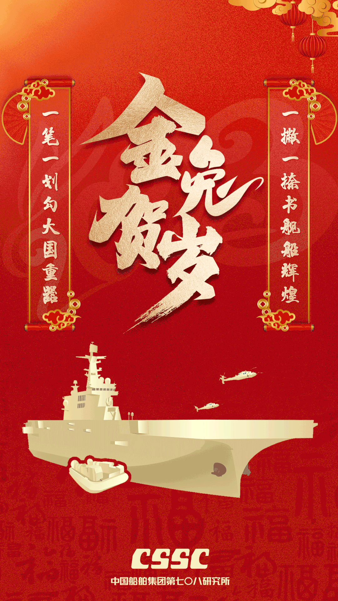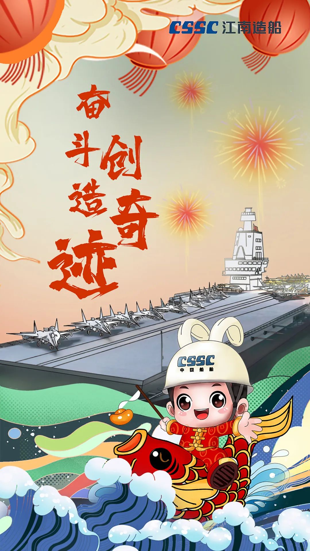 海報(bào)中所展現(xiàn)的元素,皆由大連造船元素組成,中間癸卯兔的頭冠裝飾以船錨、舵軸為主,下方航母在海中追風(fēng)逐浪,象征大連造船必將在新時(shí)代發(fā)展中踏浪前行。