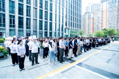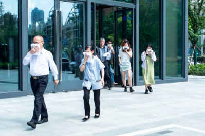 本次演練模擬總部1#樓電梯間、2#7層會議室發(fā)生火災(zāi),物業(yè)人員先后用滅火器、樓層消防水系統(tǒng)實施初期火災(zāi)撲救,火勢無法控制后立即拉響疏散警報,同時向最近的消防站請求支援。全體人員按照疏散路線緊急有序完成了疏散。