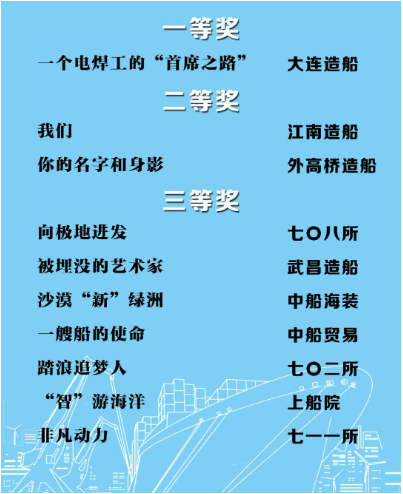 由中國船舶集團(tuán)黨群工作部指導(dǎo),中國船舶集團(tuán)新聞宣傳中心/中國船舶報(bào)社承辦的中國船舶集團(tuán)第二屆短視頻大賽圓滿落幕。經(jīng)過前期篩選,網(wǎng)絡(luò)投票,并特邀國務(wù)院國資委新聞中心、國防科工局新聞宣傳中心、中央電視臺、微博政務(wù)、中國船舶集團(tuán)黨群工作部專家評審,大賽最終評出一等獎5部,二等獎10部,三等獎23部,同時(shí)評出優(yōu)秀組織獎單位6家。名單如下,快來圍觀!