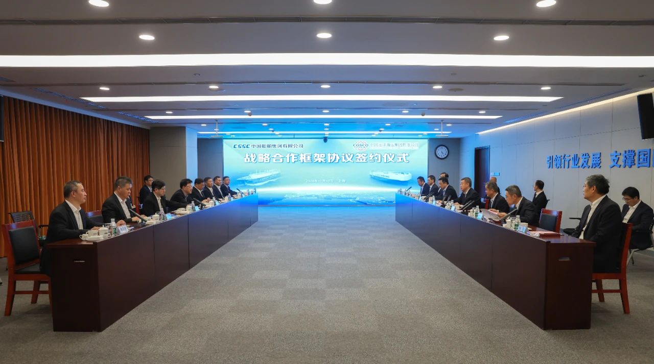 10月15日,中國船舶集團(tuán)有限公司與中國遠(yuǎn)洋海運(yùn)集團(tuán)有限公司在上海簽訂戰(zhàn)略合作框架協(xié)議。中國船舶集團(tuán)黨組書記、董事長溫剛,中遠(yuǎn)海運(yùn)集團(tuán)黨組書記、董事長萬敏,黨組副書記、總經(jīng)理朱碧新出席簽約儀式。中國船舶集團(tuán)黨組成員、副總經(jīng)理盛紀(jì)綱,紀(jì)檢監(jiān)察組組長、黨組成員彭宏,中遠(yuǎn)海運(yùn)集團(tuán)黨組成員、副總經(jīng)理、總會(huì)計(jì)師孫云飛出席簽約儀式。盛紀(jì)綱和孫云飛分別代表雙方在協(xié)議上簽字。簽約前,雙方就進(jìn)一步加強(qiáng)溝通交流、深化多領(lǐng)域合作進(jìn)行了交流探討。