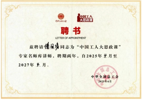近日,中華全國(guó)總工會(huì)正式聘請(qǐng)中船集團(tuán)重慶紅江傅國(guó)濤為“中國(guó)工人大思政課”專家名師庫(kù)講師,聘期兩年。這一聘任旨在推動(dòng)“大思政課”建設(shè)走深走實(shí),發(fā)揮優(yōu)秀人才在思想政治教育中的示范引領(lǐng)作用。