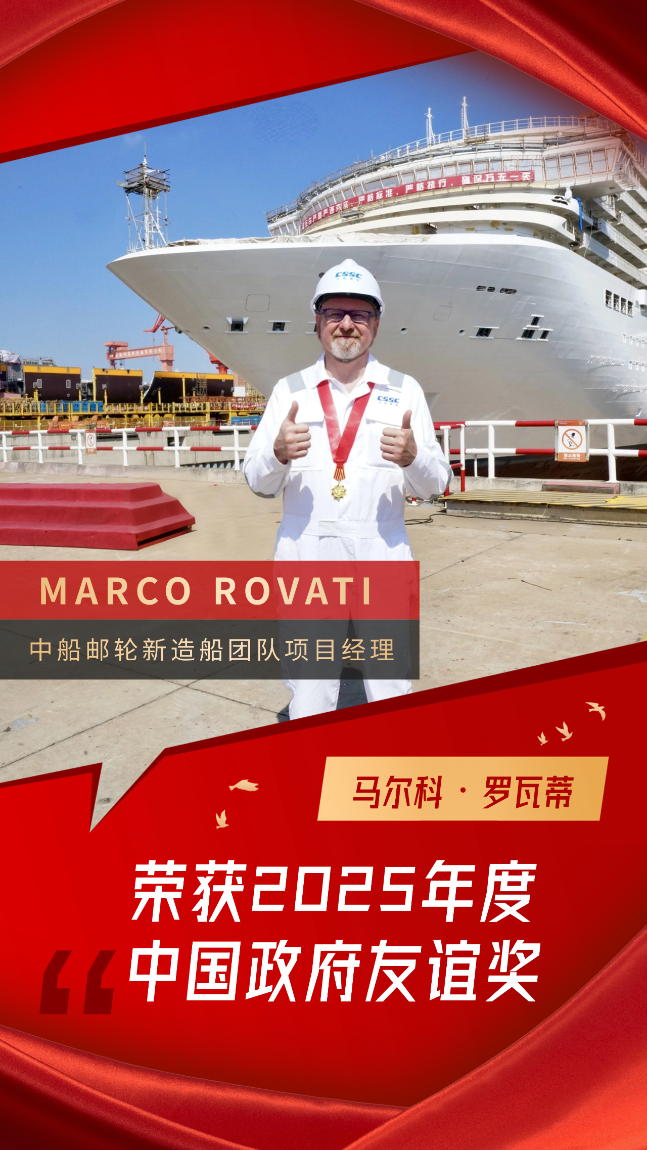 MARCO ROVATI是一位出生于1967年的克羅地亞籍郵輪工程專家,擁有超過三十年的郵輪新造船經(jīng)驗(yàn)。在獲得中國政府友誼獎后,MARCO ROVATI說:“中國政府友誼獎是我職業(yè)生涯中獲得的最重要的榮譽(yù),對我而言具有非凡意義。這份獎項(xiàng)不僅是對我過去工作的認(rèn)可,更是對我未來的激勵。我將繼續(xù)為中國郵輪產(chǎn)業(yè)的發(fā)展貢獻(xiàn)自己的力量。”