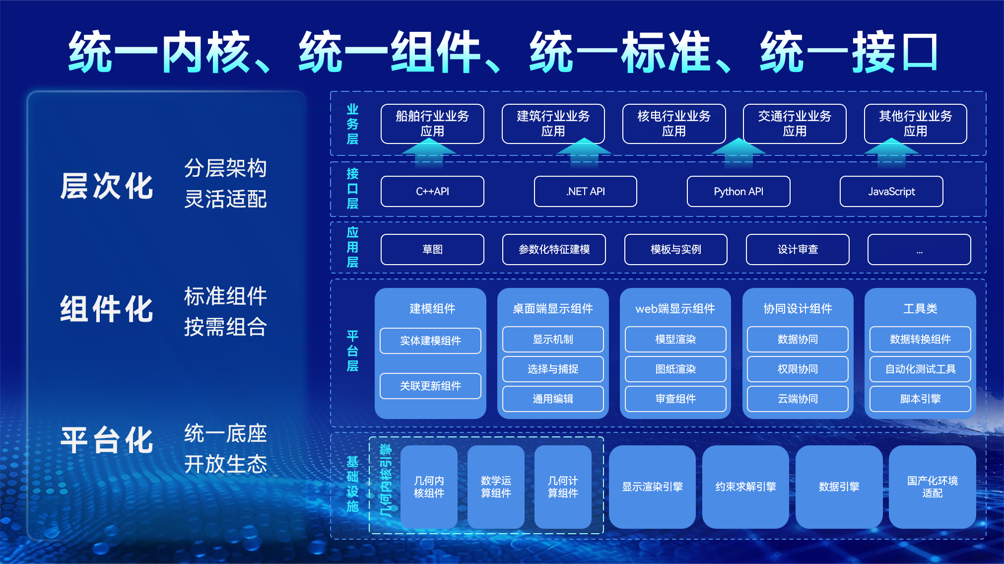 平臺確立了:統(tǒng)一內(nèi)核、統(tǒng)一組件、統(tǒng)一標(biāo)準(zhǔn)、統(tǒng)一接口的體系化架構(gòu)。