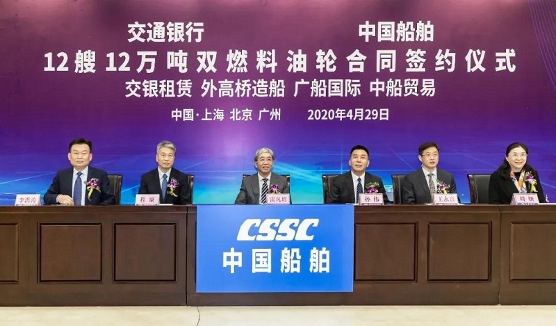 ????4月29日,中國船舶集團(tuán)有限公司旗下中國船舶工業(yè)貿(mào)易有限公司、上海外高橋造船有限公司、廣船國際有限公司與交通銀行股份有限公司旗下交銀金融租賃有限責(zé)任公司在北京、上海、廣州三地以“云簽約”方式簽署12艘12萬噸雙燃料油船建造合同,合同總金額約46億元人民幣,這是中國船舶集團(tuán)旗下單位近期承接的又一單筆大額訂單。中國船舶集團(tuán)黨組書記、董事長雷凡培,交通銀行黨委書記、董事長任德奇,中國船舶集團(tuán)黨組成員、副總經(jīng)理孫偉,交通銀行黨委委員、副行長呂家進(jìn)出席簽約儀式。