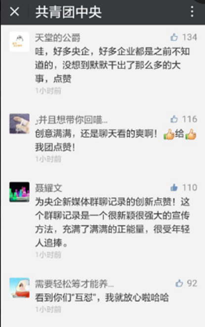 中國人民大學(xué)新聞學(xué)院教授宋建武認(rèn)為,“央企新媒體群聊記錄”的走紅,是因?yàn)檎鎸?shí)、接地氣、參與感強(qiáng),“每個(gè)人都有群聊的經(jīng)歷,這種方式使人們感覺親切、有趣”,公眾需要和喜聞樂見才是它能夠吸引人、感染人的原因。