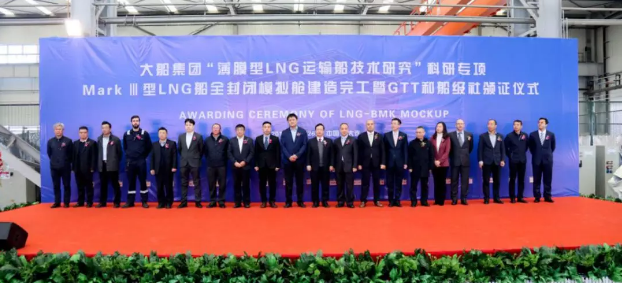 ????2019年11月26日,大船集團舉行“薄膜型LNG運輸船技術研究”科研專項MarkⅢ型LNG船全封閉模擬艙建造完工暨GTT和船級社頒證儀式。法國GTT公司、英國勞式船級社和中國船級社代表在模擬艙建造現(xiàn)場向大船集團代表頒發(fā)證書。