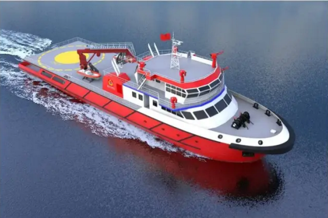綜合救援消防船總長(zhǎng)60米,配備電力推進(jìn)系統(tǒng)和直升機(jī)平臺(tái),對(duì)外消防能力達(dá)到內(nèi)河第3類消防等級(jí)。