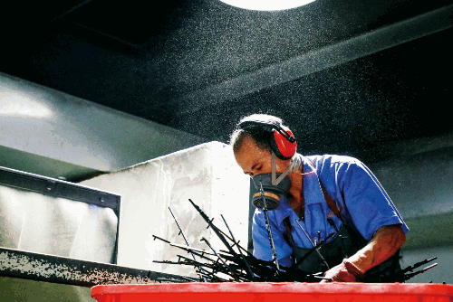 為節(jié)約成本,前衛(wèi)公司碎料工人將廢料放入廢料機(jī),再次回收利用。