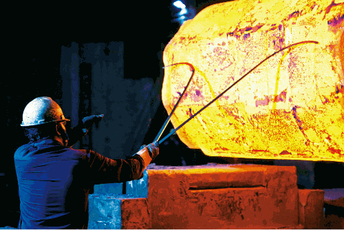 剛出爐的火紅鍛件,在臉上映出一片紅光,武漢重工鍛工師傅正站在壓機(jī)前指揮操作。