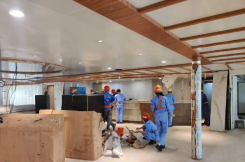 這是廣船國(guó)際阿爾及利亞豪華客滾輪內(nèi)裝收尾現(xiàn)場(chǎng)。