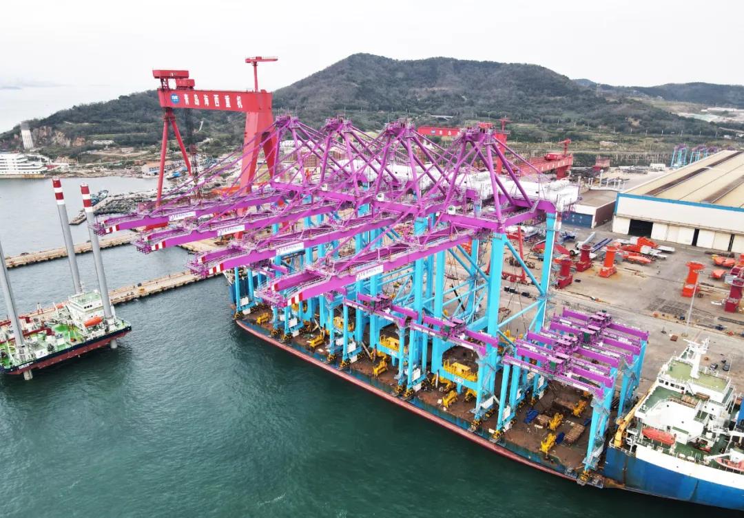 近日,武漢船機(jī)海西重機(jī)為卡塔爾哈馬德新港二期打造的4臺岸橋、10臺輪胎起重機(jī)從青島西海岸新區(qū)啟運。