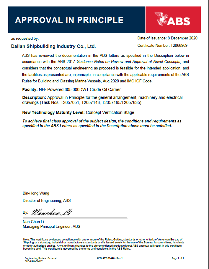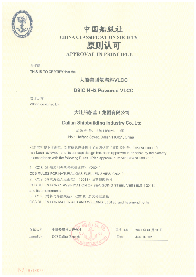 2020年,大船集團(tuán)研發(fā)的液氨動(dòng)力超大型油船(VLCC)分別取得美國(guó)船級(jí)社(ABS)和中國(guó)船級(jí)社(CCS)頒發(fā)的AIP證書。