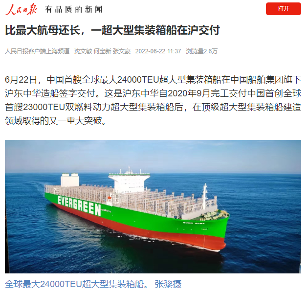 今天,中國首艘全球最大24000TEU超大型集裝箱船在中國船舶集團旗下滬東中華簽字交付,比最大航母還長,甲板面積相當于3.5個標準足球場,最大堆箱層數可達25層,相當于22樓的高度……