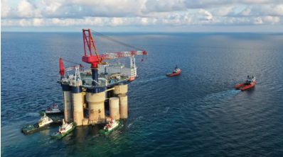 該平臺由下浮體、立柱和上甲板包組成,總長97.5米,寬度92米,高度118米,作業(yè)水深達52米,排水量17萬噸,依靠拖帶可在國內無限航區(qū)內航行、作業(yè)。