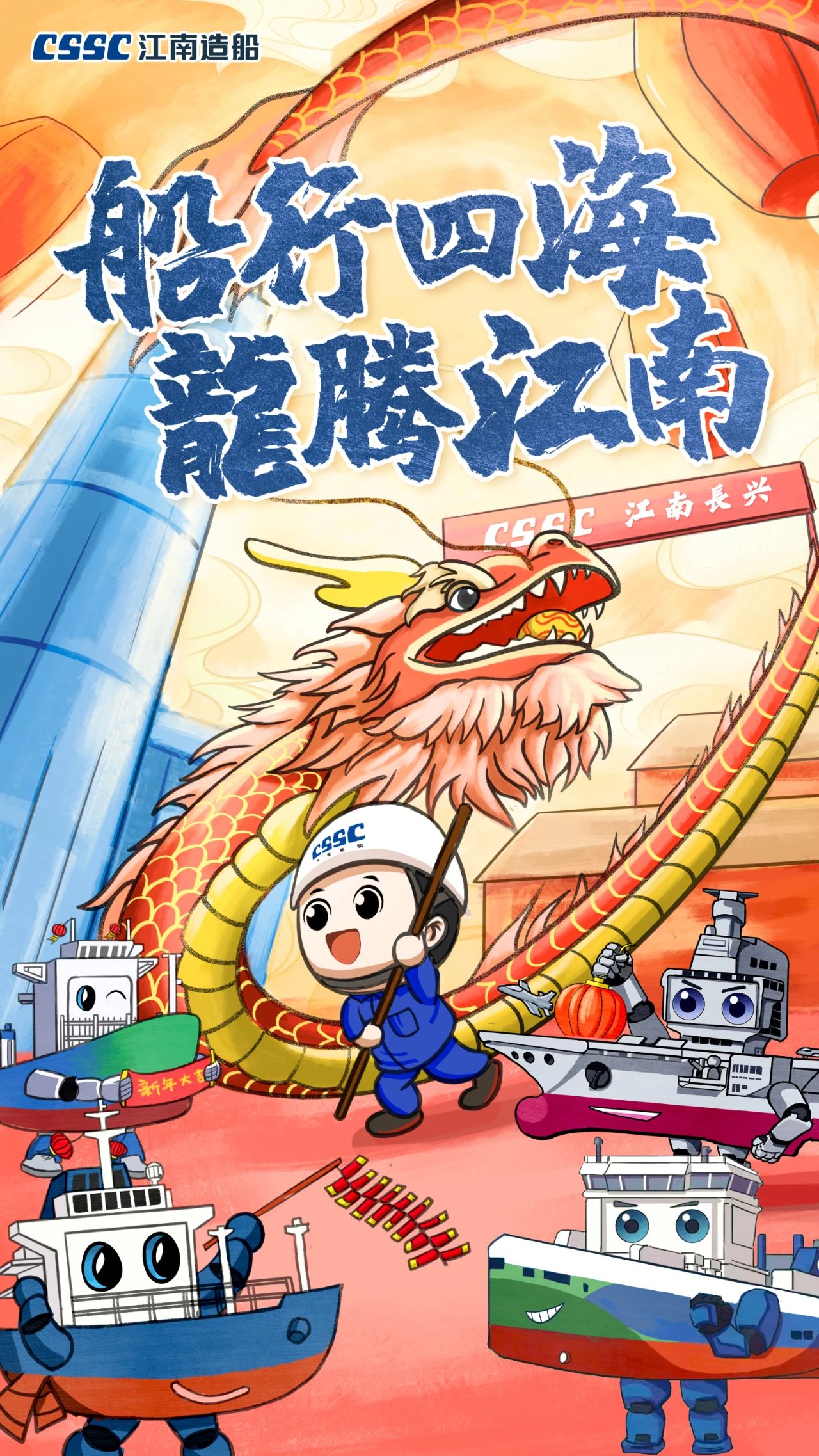 創(chuàng)意說明:海報(bào)中“江小南”舞起龍頭,預(yù)示著在新的一年,江南造船將賡續(xù)努力,龍頭揚(yáng)起、再創(chuàng)新績(jī)!而跟隨舞動(dòng)的則是目前江南造船在建的集裝箱船、液化氣船和汽車滾裝船等主產(chǎn)品系列。
