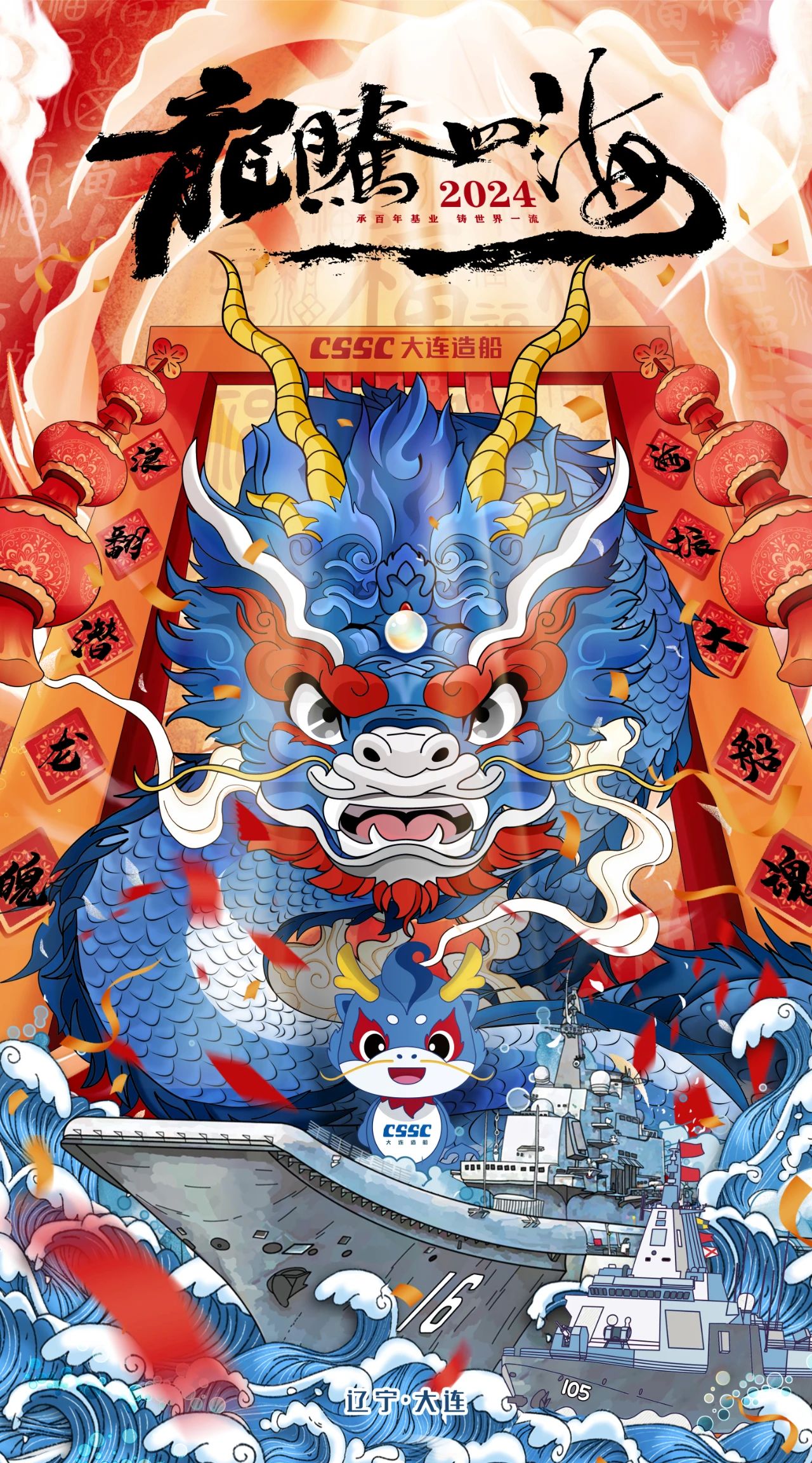 創(chuàng)意說明:采用國(guó)潮手繪風(fēng)格,將中國(guó)傳統(tǒng)文化元素和大連造船遼寧艦、大連艦等企業(yè)特色相結(jié)合,以彰顯造船龍頭企業(yè)的榮耀和奮發(fā)向上的精神。整體設(shè)計(jì)采用上中下三個(gè)部分的排列方式,比例為1:2:1。