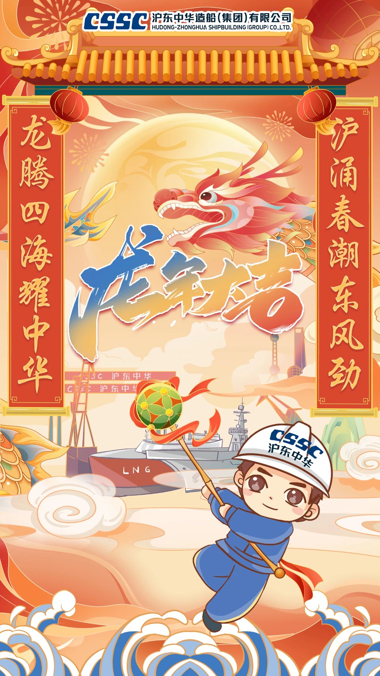 創(chuàng)意說明:海報(bào)采用國(guó)風(fēng)設(shè)計(jì),以對(duì)聯(lián)形式布局,以舞龍為海報(bào)核心。滬東中華員工手持繡球,引導(dǎo)巨龍前行,并打造出LNG運(yùn)輸船等產(chǎn)品,體現(xiàn)了滬東中華追風(fēng)踏浪、勇攀高峰的志向。