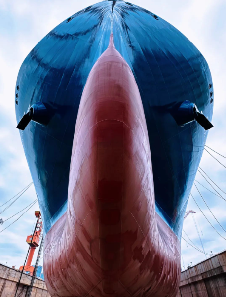 # 通過采用新型雙艉鰭線型,配備空氣潤滑系統(tǒng),進一步提升了水動力性能,增強了推進系統(tǒng)安全冗余;