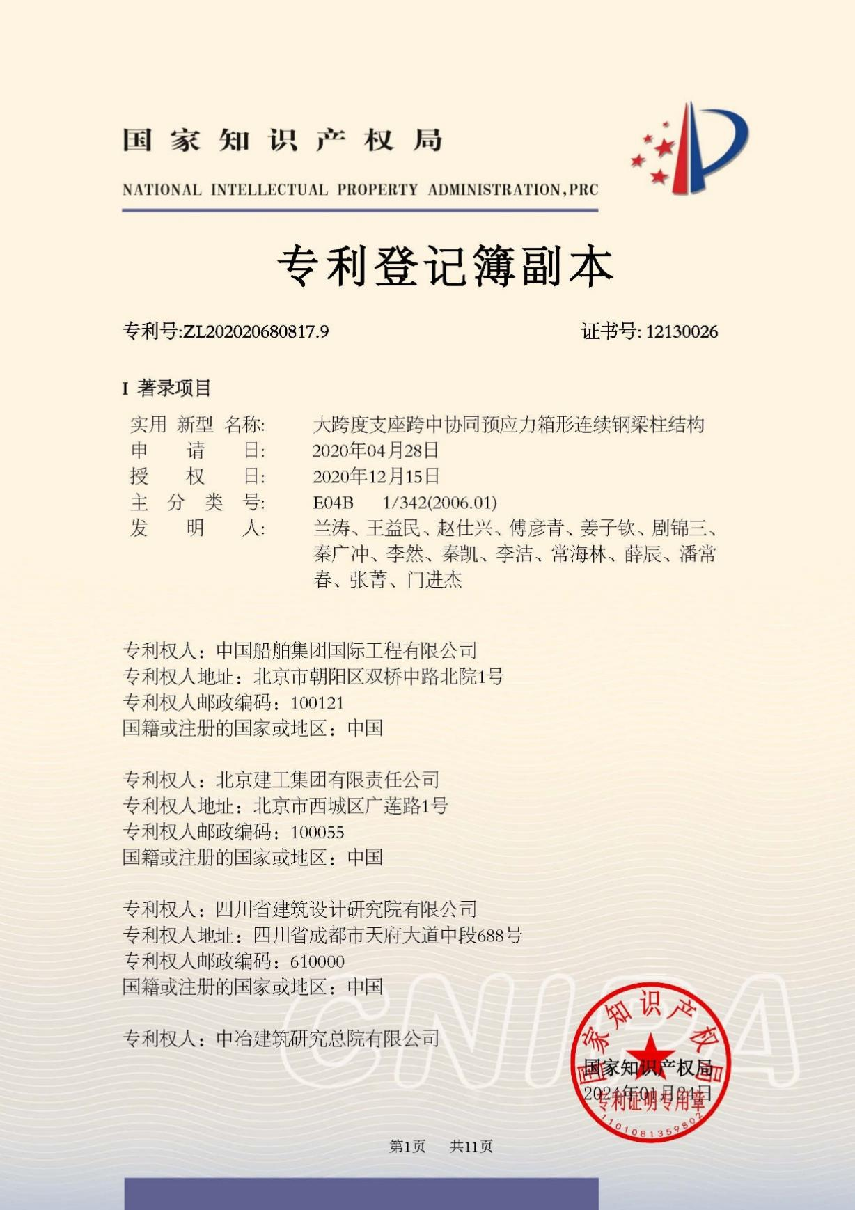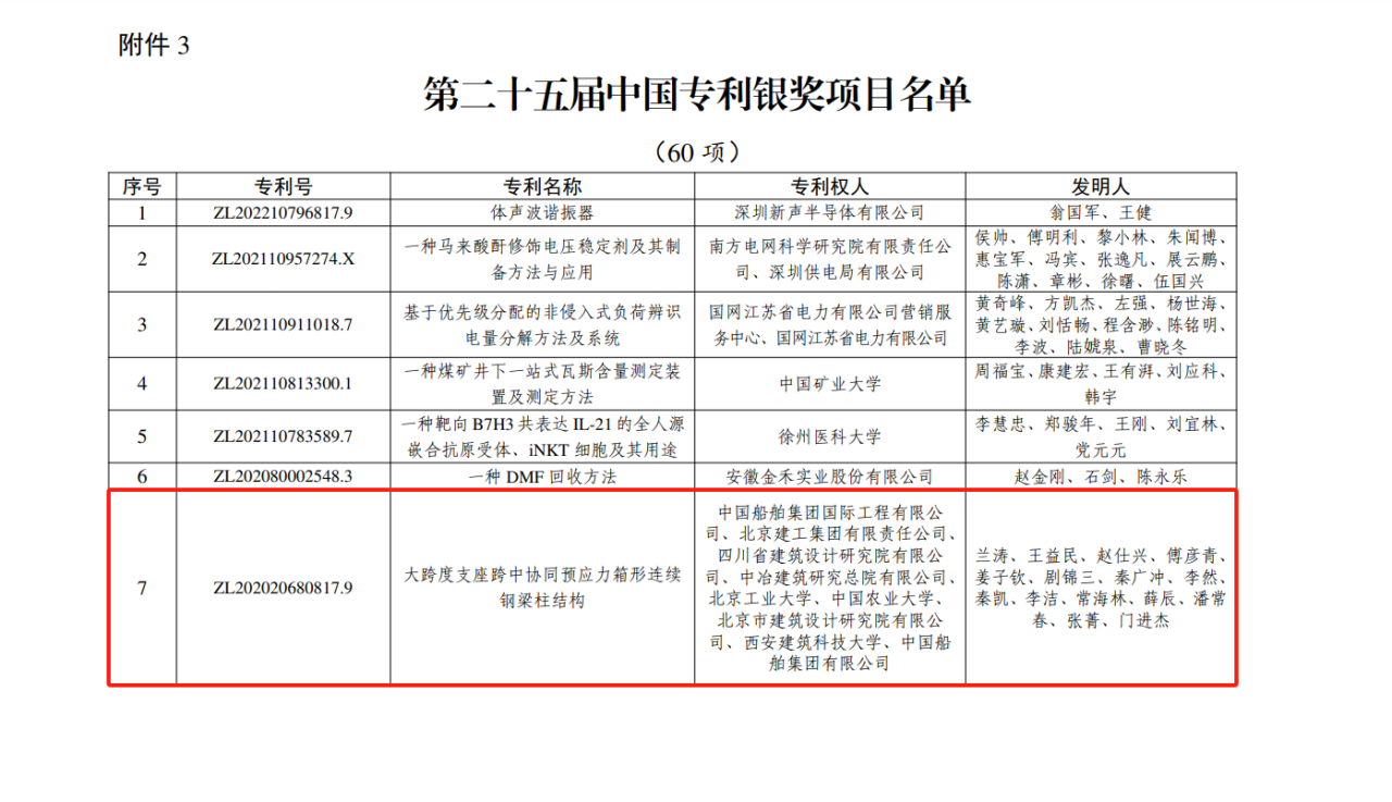 今年6月,國家知識產(chǎn)權(quán)局公布第二十五屆中國專利獎授獎決定,由中船集團(tuán)旗下中船國際工程主導(dǎo)申報的專利《大跨度支座跨中協(xié)同預(yù)應(yīng)力箱形連續(xù)鋼梁柱結(jié)構(gòu)》(專利號:ZL202020680817.9)榮獲本屆中國專利銀獎。該獎項由國家知識產(chǎn)權(quán)局與世界知識產(chǎn)權(quán)組織聯(lián)合設(shè)立,是我國專利領(lǐng)域的最高榮譽。今天,讓我們走進(jìn)中船國際工程鋼結(jié)構(gòu)工程設(shè)計與研發(fā)團(tuán)隊,聆聽他們的奮斗故事。