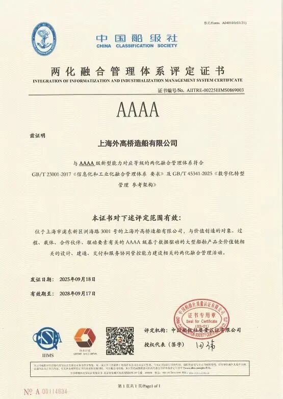 日前,全國兩化融合管理體系評(píng)定工作委員會(huì)公布兩化融合管理體系3.0和數(shù)字化轉(zhuǎn)型管理體系首批4A/5A級(jí)評(píng)定企業(yè)名單,中國船舶集團(tuán)有限公司旗下外高橋造船成為首批29家獲證的企業(yè)之一,也成為首批獲得4A級(jí)認(rèn)證的船海企業(yè)。