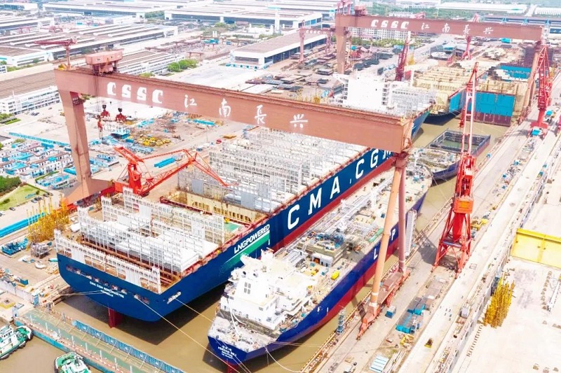 ????眾所周知,船塢是船舶總組搭載的場(chǎng)所,是造船生產(chǎn)的核心資源。江南造船3號(hào)船塢長(zhǎng)580米、寬120米,是目前國(guó)內(nèi)在用的最大船塢。為提升船塢利用效率,江南造船采取“雙線(xiàn)并造”模式,即一批次液化氣船和一批次超大型集裝箱船同時(shí)建造。此次雙船出塢是江南造船“雙線(xiàn)并造”模式的第五個(gè)批次,也是今年3號(hào)塢出塢的第二個(gè)批次。