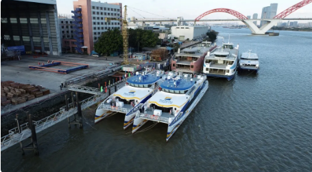 2020年12月30日,中國(guó)船舶集團(tuán)旗下遠(yuǎn)舟公司所屬英輝南方造船(廣州番禺)有限公司建造的“新海韻”號(hào)、“新海駿”號(hào)兩艘鋁合金雙體高速客船,同時(shí)在廣州市番禺區(qū)英輝南方碼頭順利交付。“新海韻”、“新海駿”是英輝南方為船東建造的藍(lán)色干線系列高速客船的第8和第9艘,船長(zhǎng)42.8米,寬10.3米,載客199人,設(shè)計(jì)航速35節(jié)。遠(yuǎn)舟公司所屬英輝南方在鋁合金高速客船第三代船型基礎(chǔ)上,開展技術(shù)創(chuàng)新和船型優(yōu)化,開發(fā)完成了“新海韻”、“新海駿”為代表的第四代新船型。