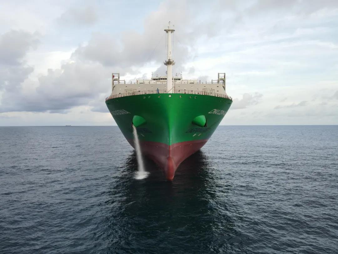 采用薄膜型燃料艙、雙燃料推進(jìn)。以LNG為主要燃料,采用了中國船舶集團(tuán)自主品牌主機(jī)雙燃料WinGD主機(jī),配置了GTT MARK III薄膜式燃料艙,容量達(dá)14000立方米,可支持船舶往返亞歐航線。