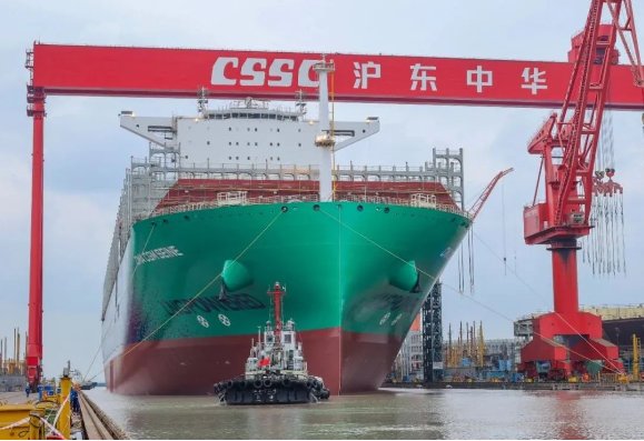 11月20日,由中國船舶集團旗下滬東中華建造的全球最大24000TEU級液化天然氣(LNG)雙燃料動力超大型集裝箱船首制船,提前10天順利出塢。