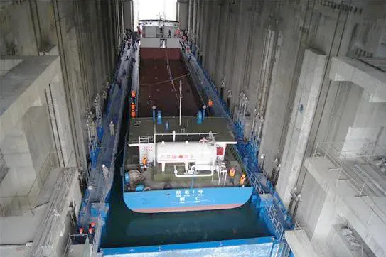 而在上述水電站過船設(shè)施工程建設(shè)中,也出現(xiàn)了中國船舶集團旗下院所、船廠、配套企業(yè)等相關(guān)單位的身影。烏江構(gòu)皮灘水電站通航工程被視為貴州融入長江、通江達(dá)海的關(guān)鍵工程。該工程線路總長2306米,概算總投資29.51億元,設(shè)計通航標(biāo)準(zhǔn)為四級航道,最高通航水頭達(dá)199米,是世界上通航水頭最高、水位變幅最大的通航工程。
