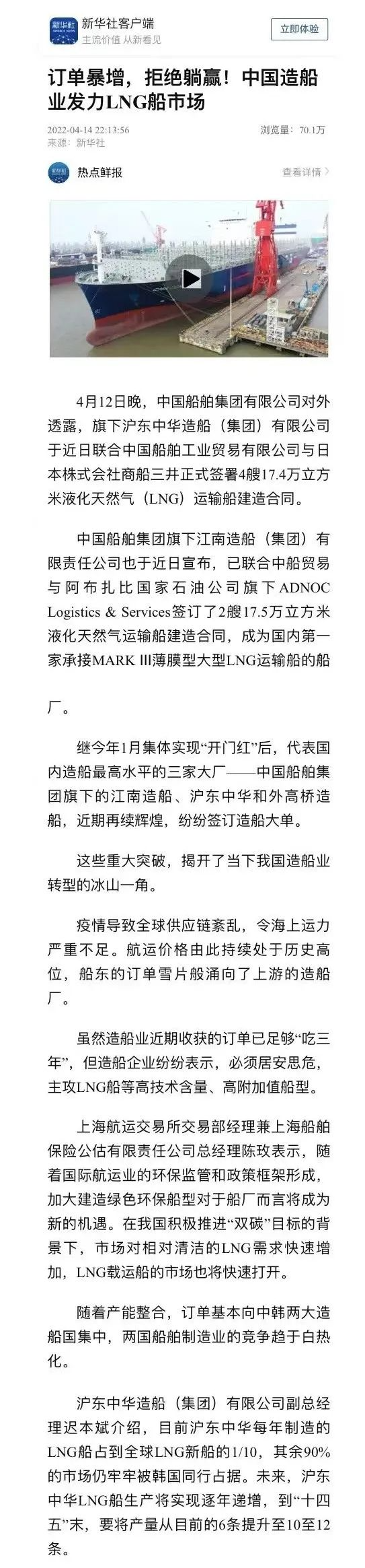 近日,新華社以《訂單暴增,拒絕躺贏!中國(guó)造船業(yè)發(fā)力LNG船市場(chǎng)》為題,關(guān)注了中國(guó)船舶集團(tuán)發(fā)力LNG船市場(chǎng)接連簽訂造船大單的重大突破!