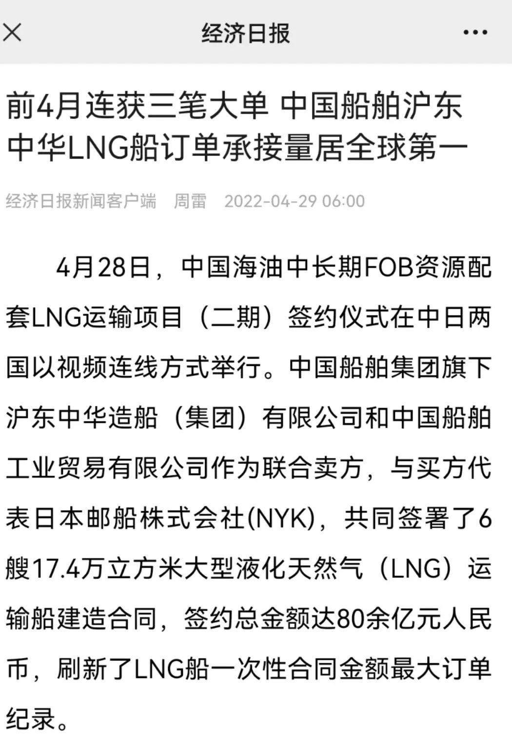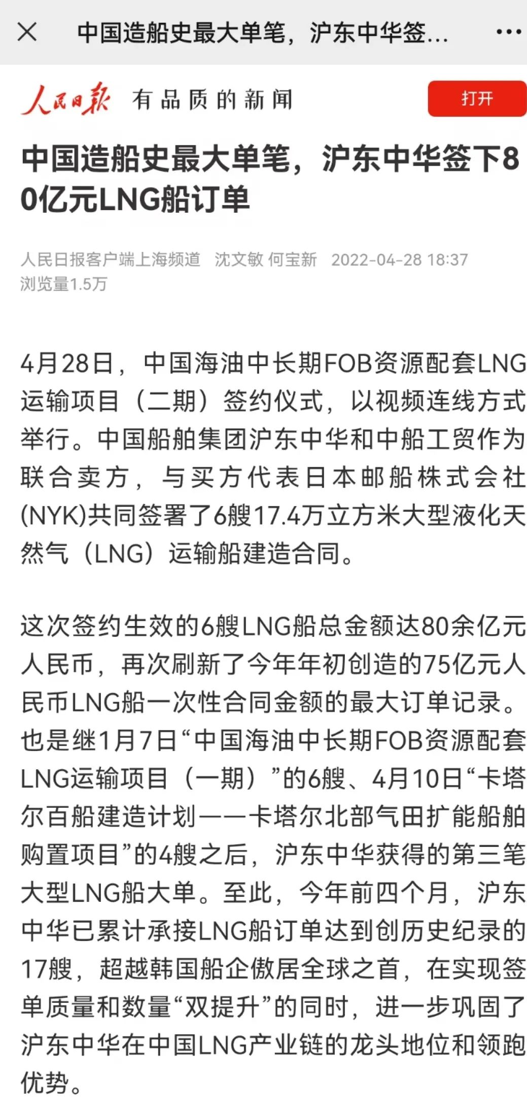 這次簽約生效的6艘LNG船總金額達(dá)80余億元人民幣,再次刷新了今年年初創(chuàng)造的LNG船一次性合同金額最大訂單紀(jì)錄。至此,今年前4個月滬東中華已累計承接LNG船訂單達(dá)到創(chuàng)歷史紀(jì)錄的17艘,超越韓國船企傲居全球之首,在實現(xiàn)簽單質(zhì)量和數(shù)量“雙提升”的同時,進(jìn)一步鞏固了滬東中華在中國LNG產(chǎn)業(yè)鏈的龍頭地位和領(lǐng)跑優(yōu)勢。