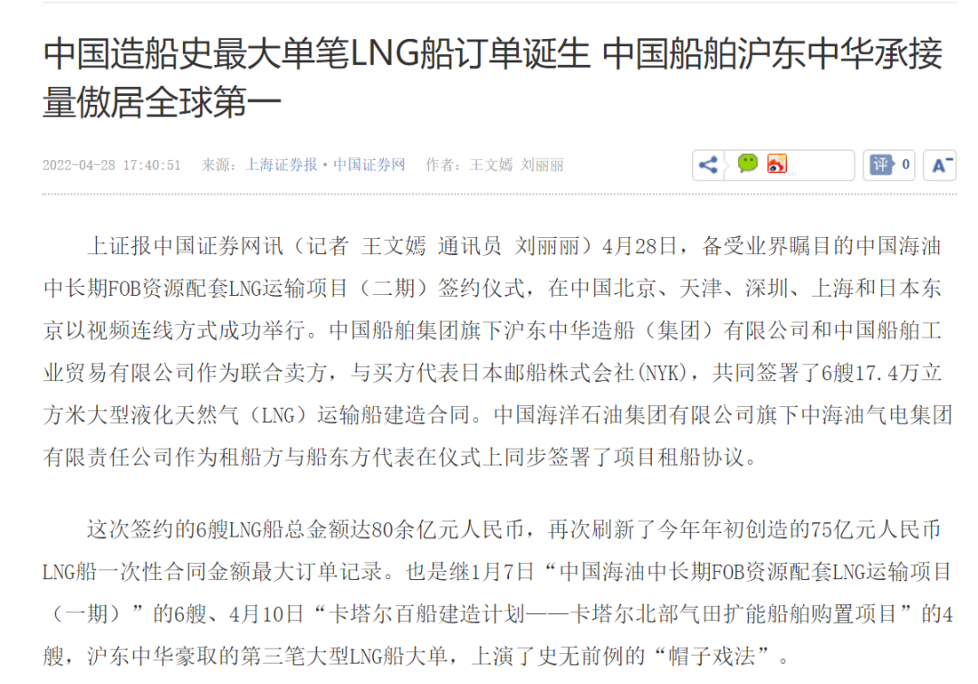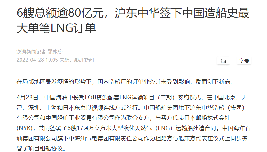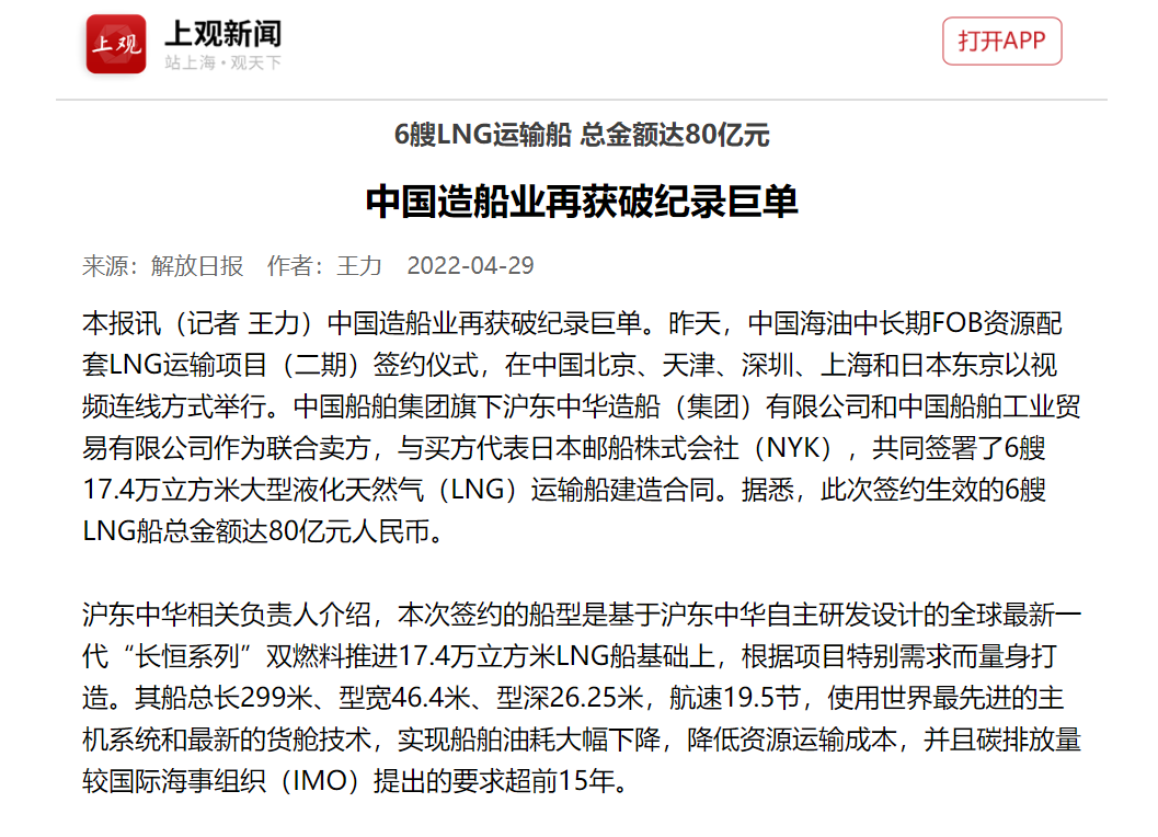 4月28日,中國海油中長期FOB資源配套LNG運輸項目(二期)簽約儀式,在中國北京、天津、深圳、上海和日本東京以視頻連線方式成功舉行。中國船舶集團(tuán)有限公司旗下滬東中華和中船貿(mào)易作為聯(lián)合賣方,與買方代表日本郵船株式會社(NYK),共同簽署6艘17.4萬立方米大型液化天然氣(LNG)運輸船建造合同。