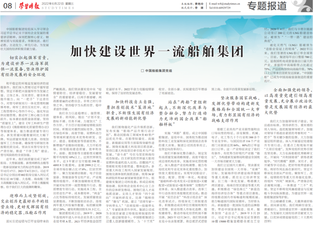 6月22日,《學(xué)習(xí)時(shí)報(bào)》發(fā)表中國(guó)船舶集團(tuán)黨組署名文章《加快建設(shè)世界一流船舶集團(tuán)》,萬(wàn)山磅礴看主峰,大潮奔涌好揚(yáng)帆,面向新征程,中國(guó)船舶集團(tuán)將踔厲奮發(fā)、勇毅前行,為發(fā)展壯大國(guó)有經(jīng)濟(jì)貢獻(xiàn)更大力量,以優(yōu)異成績(jī)迎接黨的二十大勝利召開。