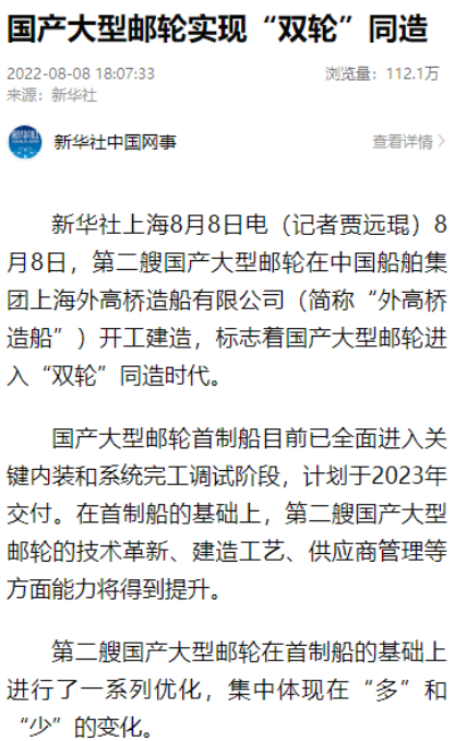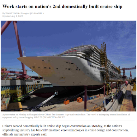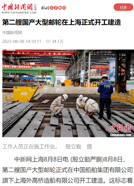 8月8日,第二艘國(guó)產(chǎn)大型郵輪在中國(guó)船舶集團(tuán)旗下外高橋造船開建,這標(biāo)志著中國(guó)船舶工業(yè)已初步掌握大型郵輪設(shè)計(jì)建造關(guān)鍵核心技術(shù)。