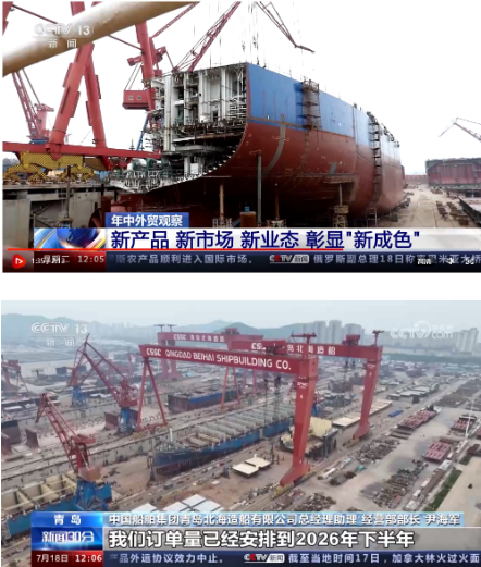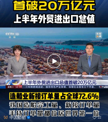 7月18日,央視《新聞30分》年中外貿(mào)觀察鏡頭再次對(duì)準(zhǔn)火熱的造船市場(chǎng),在出口面臨較大外需壓力的背景下,上半年,中國(guó)外貿(mào)頂住了壓力、穩(wěn)住了規(guī)模、提升了質(zhì)量,既呈現(xiàn)出“韌性”底色,又展現(xiàn)了多種“新”的成色。