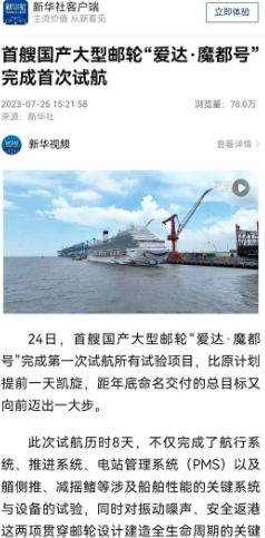 7月24日晚,首艘國產(chǎn)大型郵輪“愛達(dá)·魔都號”完成第一次試航所有試驗(yàn)項(xiàng)目比原計劃提前一天凱旋,人民日報、新華社、中央電視臺等中央主流媒體進(jìn)行了報道。