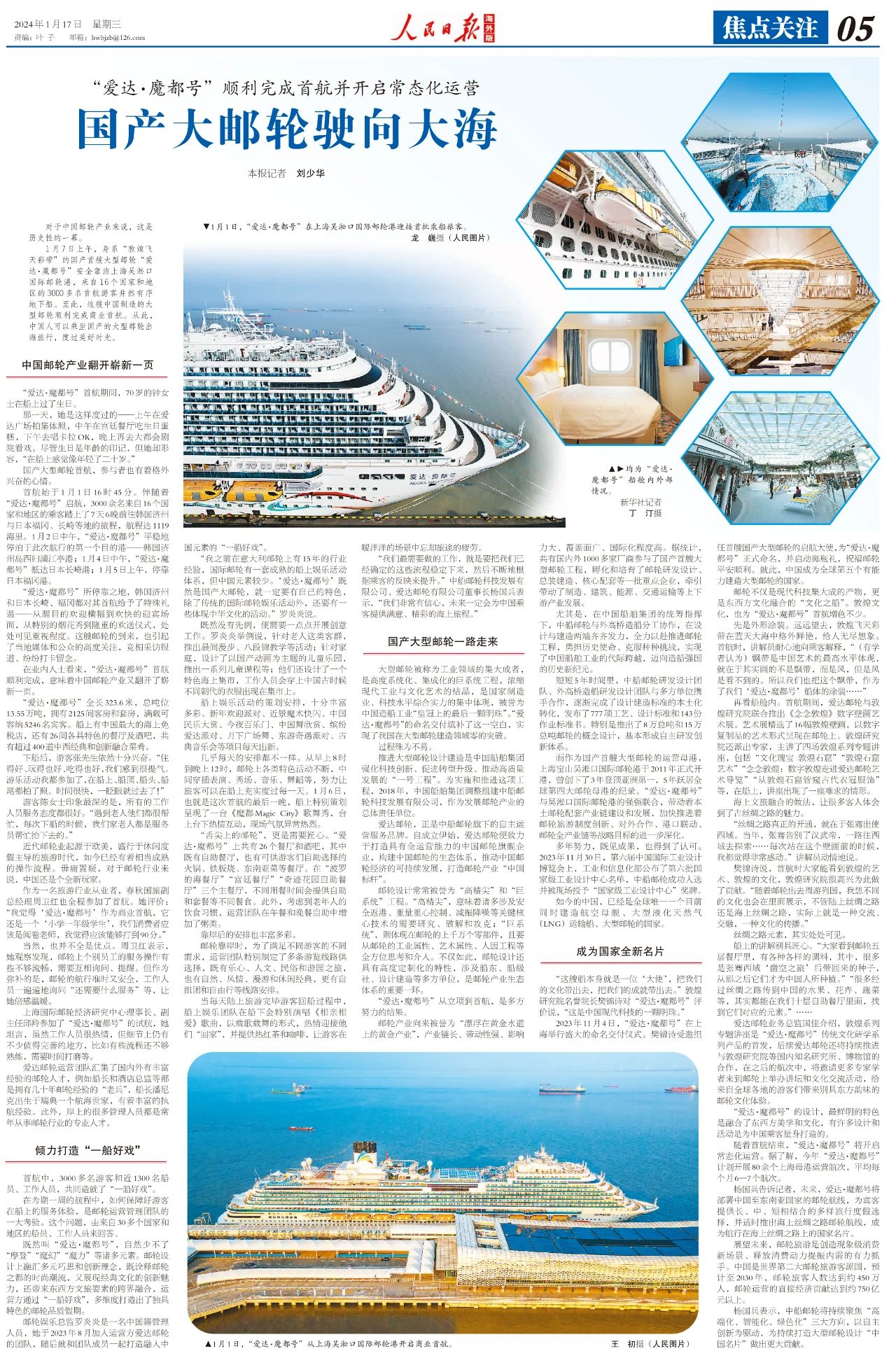 1月17日,人民日報海外版第五版焦點關(guān)注刊發(fā)整版文章,聚焦“愛達(dá)·魔都號”。