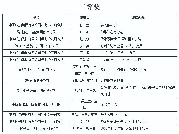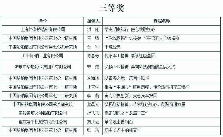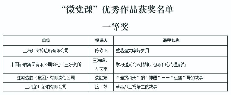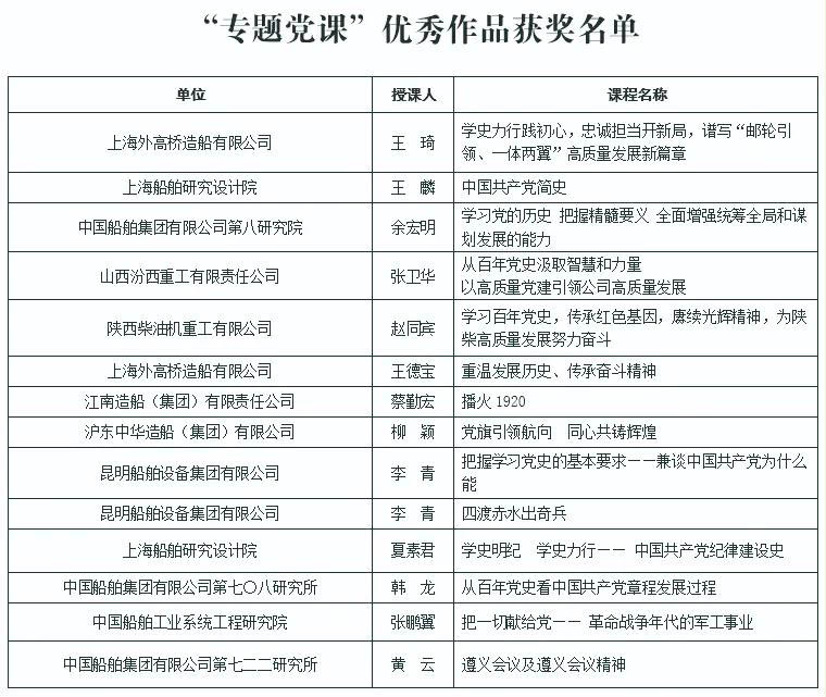 為慶祝中國(guó)共產(chǎn)黨成立100周年,深入推進(jìn)黨史學(xué)習(xí)教育,由中國(guó)船舶集團(tuán)黨群工作部主辦,中國(guó)船舶集團(tuán)黨校承辦的慶祝中國(guó)共產(chǎn)黨成立100周年黨課評(píng)選活動(dòng)結(jié)果今天正式揭曉。
